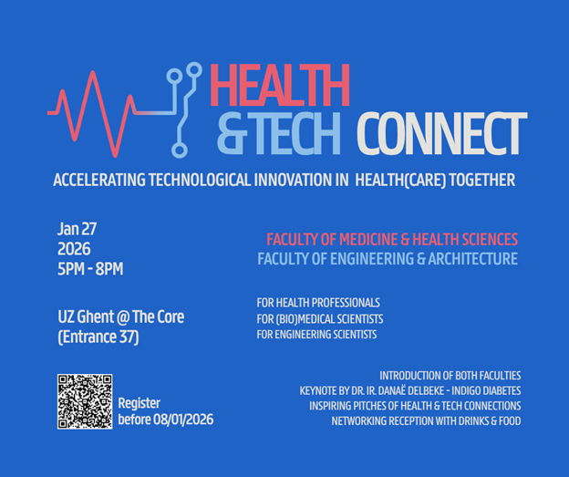 Join us on Tuesday, 27 January 2026, at Campus UZ Ghent for Health & Tech Connect 2026, a unique networking event where the Faculties of Medicine & Health Sciences and of Engineering & Architecture bring together health professionals, (bio)medical researchers and engineers to foster technological innovation in health(care).